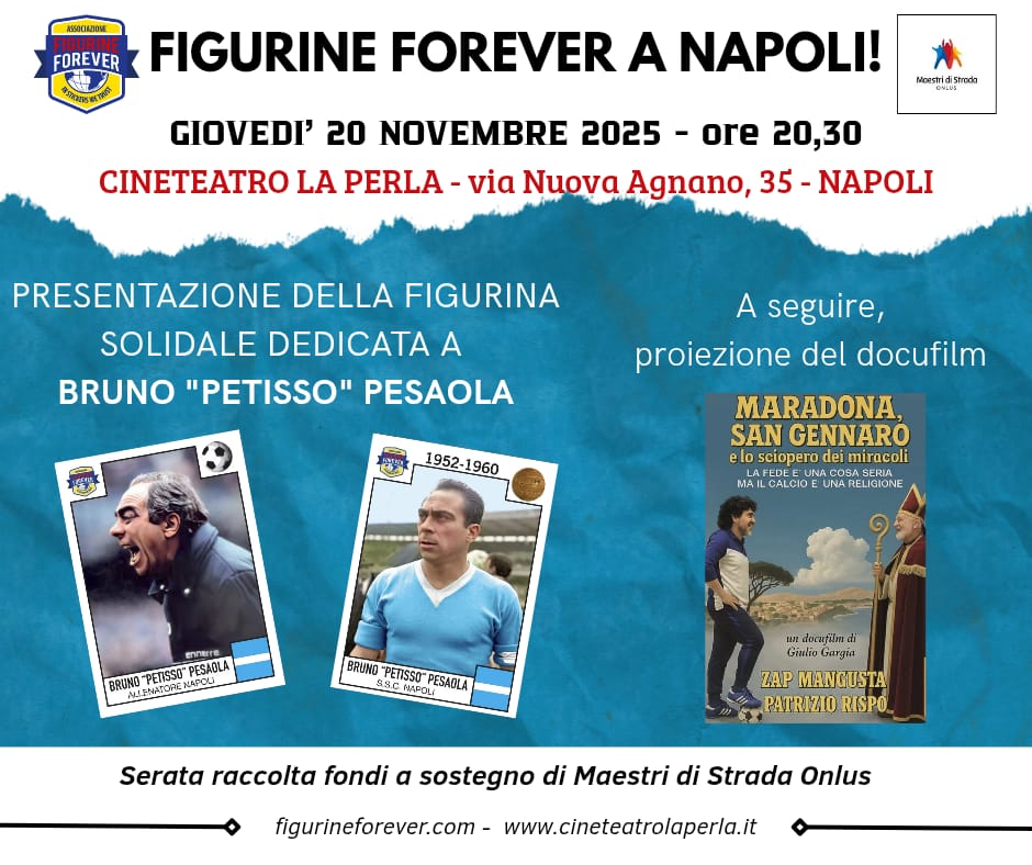 Giovedi 20 novembre alle 20 e 30, al Cineteatro La Perla a Napoli presentazione della figurina solidale dedicata a Bruno Pesaola e il docufilm “Maradona, San Gennaro e lo sciopero dei miracoli ”.